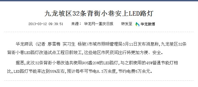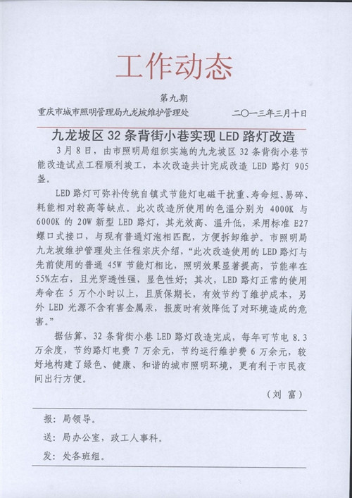Congratulations from Chongqing City Lighting Management Bureau to organize, our R & D and manufacturing of "ten Hui card" Beijiexiaoxiang integration easy disassembly LED special energy-saving lamps "Jiulongpo Beijiexiaoxiang energy-saving pilot project successfully completed (case - outdoor lighting energy-saving http://duxqx.cn/gongchengshishianli/shiwailvsezhaomingjienenggaizaoanli/2013-10-14/16.html). Please see the Hualong network and Chongqing City Lighting Management Bureau Maintenance Management Office published the "dynamic Jiulongpo 32 Beijiexiaoxiang LED street reconstruction":