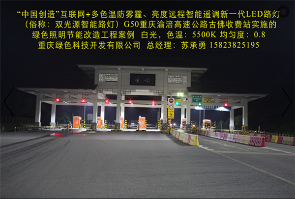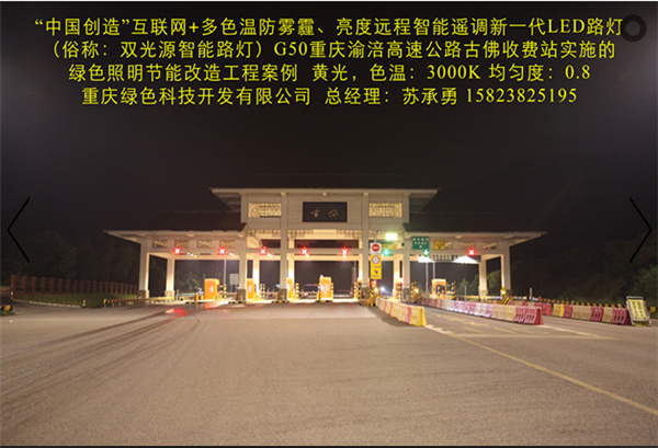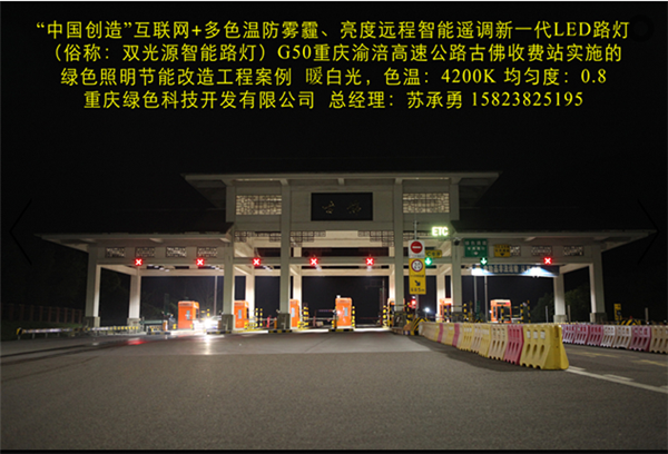 我司在G50重慶渝涪高速公路古佛收費(fèi)站實(shí)施的“中國(guó)創(chuàng)造”互聯(lián)網(wǎng)+多色溫防霧霾LED全智能路燈綠色照明節(jié)能改造工程,使用的“中國(guó)創(chuàng)造”互聯(lián)網(wǎng)+多色溫防霧霾LED全智能路燈及智能管理系統(tǒng),其具備多項(xiàng)特點(diǎn):(一)通過(guò)PM2.5、溫度、光敏、色溫、超聲波雷達(dá)等傳感器、高清攝像頭自動(dòng)采集智慧城市所需的環(huán)保、氣象、交通、安防等公共數(shù)據(jù)信息,通過(guò)“云平臺(tái)”實(shí)現(xiàn)共享,并利用智慧城市網(wǎng)絡(luò)、LED彩屏、微信、短信等信息平臺(tái),向社會(huì)免費(fèi)提供各類信息及Wifi等服務(wù)。(二)在不同氣候和季節(jié),可根據(jù)人們的感官需求及環(huán)境氣候的變化,通過(guò)溫度、濕度、PM2.5等傳感器遠(yuǎn)程智能調(diào)控?zé)艟叩纳珳?、亮度,?shí)現(xiàn)多種色溫、亮度舒適安全照明。遠(yuǎn)程智能控制系統(tǒng)自動(dòng)采集照明環(huán)境溫度、雨、霧、霾、雪、沙塵等數(shù)據(jù),智能將燈光色溫精細(xì)化調(diào)節(jié)到最舒適、最安全的照明值。在雨、霧、霾、雪、沙塵暴等惡劣天氣下,通過(guò)遠(yuǎn)程智能控制系統(tǒng)(包括手機(jī)APP)調(diào)控?zé)艄庹彰魃珳兀褂么┩改芰?qiáng)的黃光(3000K色溫)照明,有效保障了在雨、霧、霾、雪、沙塵暴天氣下城市路燈安全照明和行車安全;在正常天氣下,根據(jù)環(huán)境溫度將燈光色溫智能調(diào)控為最舒適照明狀態(tài)。(三)根據(jù)不同時(shí)間段、光照度、車流量等情況,分別通過(guò)光敏、超聲波、雷達(dá)等傳感器智能調(diào)控?zé)艟?,?shí)現(xiàn)多種亮度燈光照明模式??稍诓煌瑫r(shí)段將燈光智能調(diào)整為“白天”、“夜間”、“夏季”、“冬季”、“防霧霾”等多種照明模式,從而極大提高節(jié)電率,同時(shí)有效解決隧道照明為了節(jié)電普遍采用的關(guān)閉控制回路或者間隔關(guān)燈方式而造成照明暗區(qū),存在交通安全隱患的問(wèn)題,實(shí)現(xiàn)無(wú)暗區(qū)的二次節(jié)能和安全、舒適照明,確保行車安全。(四)路面亮度均勻度、照度均勻度、節(jié)能率等重要參數(shù)均優(yōu)于LED路燈國(guó)家標(biāo)準(zhǔn)。互聯(lián)網(wǎng)+多色溫防霧霾LED全智能路燈一盞可當(dāng)多盞普通單色溫LED路燈使用,性價(jià)比更高,可提高光效10%,延長(zhǎng)燈具使用壽命一倍以上。智能調(diào)色、調(diào)光,確保照明更加舒適、安全、節(jié)能。