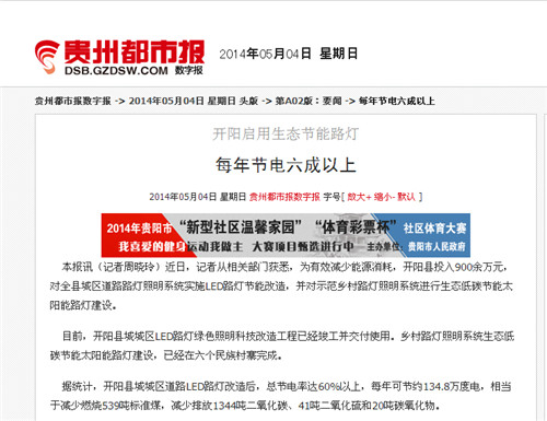 熱烈祝賀我司實施改造的貴州省開陽縣縣城LED路燈工程被貴州省主流媒體《貴州都市報》肯定。2014年5月4日《貴州都市報》對我司實施改造的貴州省開陽縣縣城LED路燈工程進行了報道,現(xiàn)將全文轉(zhuǎn)載如下: